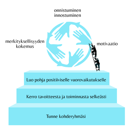 Positiivinen yhteishenki, tunnelma ja toimintakulttuuri synnytetään ja ylläpidetään viestinnällä. Yhteinen valmistautuminen, avoin tiedottaminen tulevista asioista ja aktiivinen vuorovaikutus hälventävät epävarmuutta ja epätietoisuutta. Anna mahdollisuus kysyä ja kerää toiminnasta kiinnostuneiden yleisimpiä kysymyksiä julkaisuihin ja tiedotteisiin. Ystävällinen ja selkeä tyyli edistävät turvallista ja avointa ilmapiiriä. Vastaa aina kysymyksiin ja lisätietopyyntöihin.